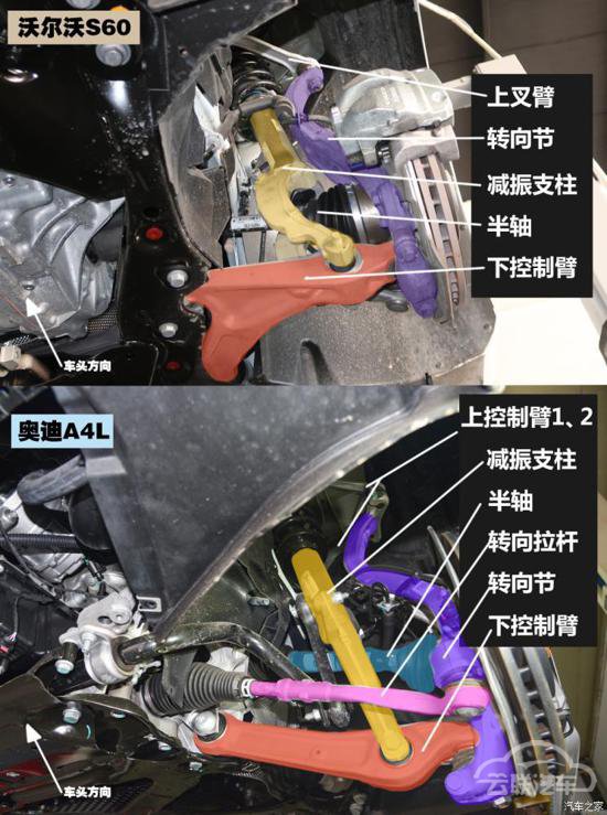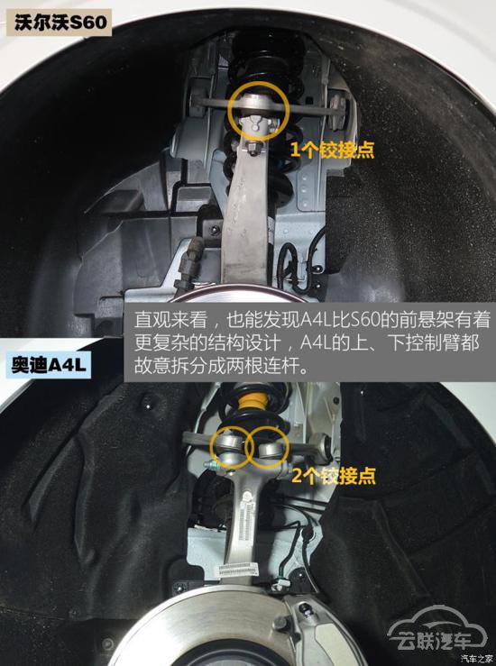 由于两车都基于自家的平台化技术,所以悬架结构也与前辈们保持了类似的设计,底盘数据和调校经验都可以借鉴到新车上来。另外,s60和a4l在悬架方面都采用了不少铝合金材质,不规则的造型是为了用更少的材料来达到需要的强度,轻量化设计水平都是不错的。