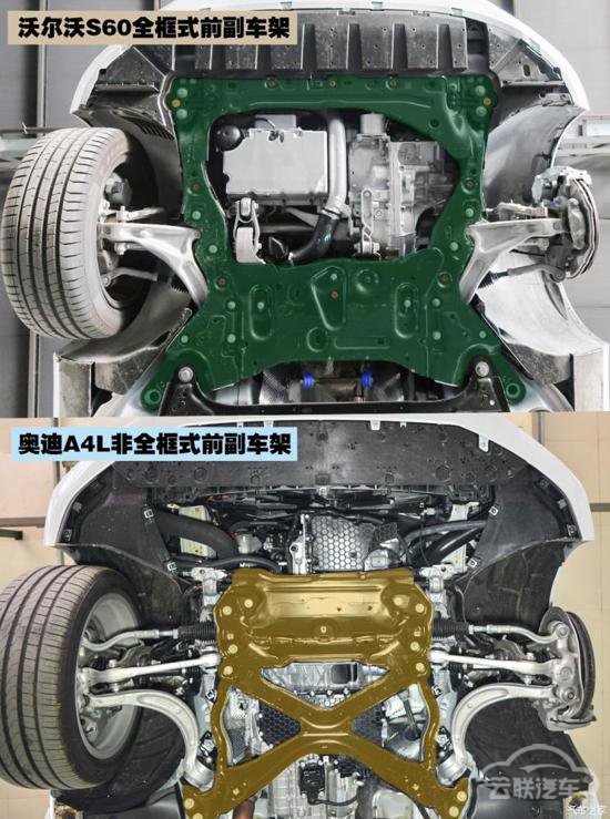 沃尔沃一直以来用安全著称,这让它在同级别的豪华车里有着明确的定位和特点,在底盘方面我们也能发现它比其他车型更加强调安全性的设计细节。把a4l和s60的前副车架放在一起,你就能发现一些差别。