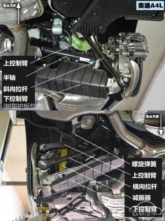 为了更清楚地对比两款车在底盘设计方面的不同,我们还是按照老套路把底盘举升了起来,卸掉一侧车轮,然后拆掉发动机舱和车底的部分护板。底盘结构、用料和细节做工便清楚地展示了出来。