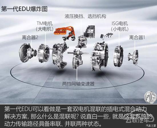 这期内容略有些烧脑,还请大家耐心细看。咱们今天要聊的主角,是搭载于上汽名爵ehs车型上的动力总成,这套混动系统的核心在于一个关键零部件:官方称之为第二代edu电驱变速箱的结构。就是这套结构,目前都已经不声不响地发展到了第二代产品,而且更为有趣的是,第一代与第二代edu并非直接升级而来,而是两套差异很大的系统。