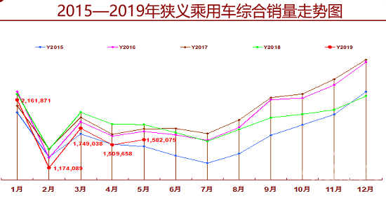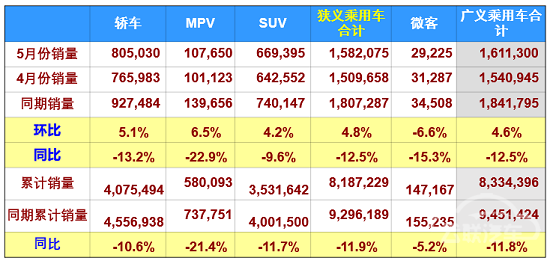 昨日(6月11日),全国乘用车市场信息联席会(以下简称“乘联会”)发布数据显示:5月,我国狭义乘用车销量为1582075辆,同比下滑12.5%,环比上升4.8%。同比降幅与前4月基本持平,较上月有所收窄,而环比增长5%,则在历史上基本没有出现过。