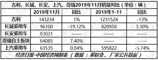 车市“寒冬”之下,有着“自主三强”之称的吉利、长城、长安顶住了整体下行压力,一定程度上实现逆势“破冰”。其中,长城汽车旗下各个业务板块实现“全面开花”,乘用车前11个月销量达820958辆,同比上涨3.3%;首款全球化乘用大皮卡——长城炮“一炮而红”,实力诠释“长城速度”。吉利汽车凭借各业务板块的稳步驱动,有望成功卫冕“自主一哥”。长安汽车在今年后半程依靠“新车效应”全面回暖,也留在“三强”队列之中。