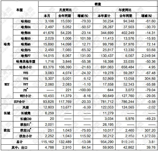 其中,哈弗、WEY、欧拉和长城皮卡分别销售83378辆、10450辆、2252辆和19062辆。在国内销量稳步增长的同时,长城汽车海外销量也不断取得突破。11月,长城汽车出口新车4788辆,同比增幅高达64.54%,1-11月累计出口新车59905辆,同比劲增39.76%。