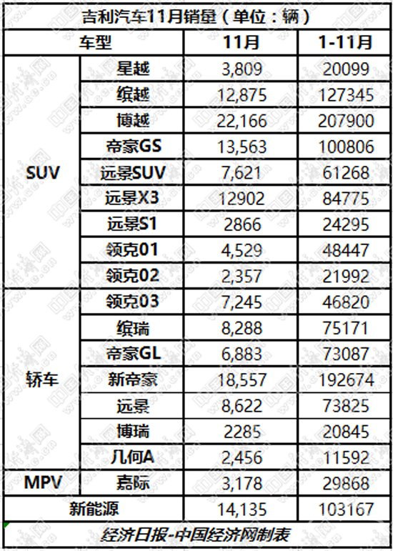 在吉利方面看来,“在车市寒冬下连续2个月实现环比、同比双增长,得益于自身对库销比、产品结构等各方面的主动调整。”具体来看,11月,吉利SUV板块共销售85720辆,占其当月总销量的59.8%;旗下高端品牌领克销量为14131辆,领克01、02、03销量分别为4529辆、2357辆、7245辆。