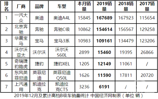 经过统计、计算,经济日报-中国经济网记者发现2019年的两点独特之处:首先,奥迪A4L、奔驰C级和宝马3系为代表的“头部”阵营,也齐刷刷地“下行”,尚属首次,凸显了高档B级车市场的巨大压力;其次,与2018年相比(当时只有沃尔沃S60销量同比下滑),2019年继续呈现“马太效应”,二线竞品下滑幅度大、体量小,很可能沦落为市场边缘。