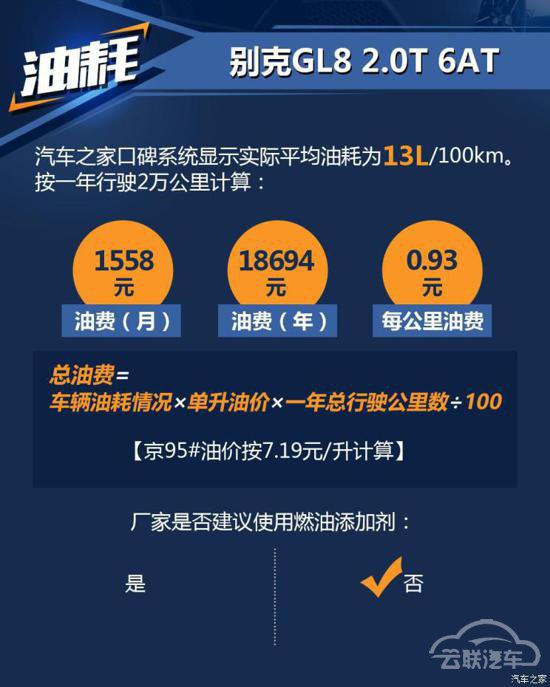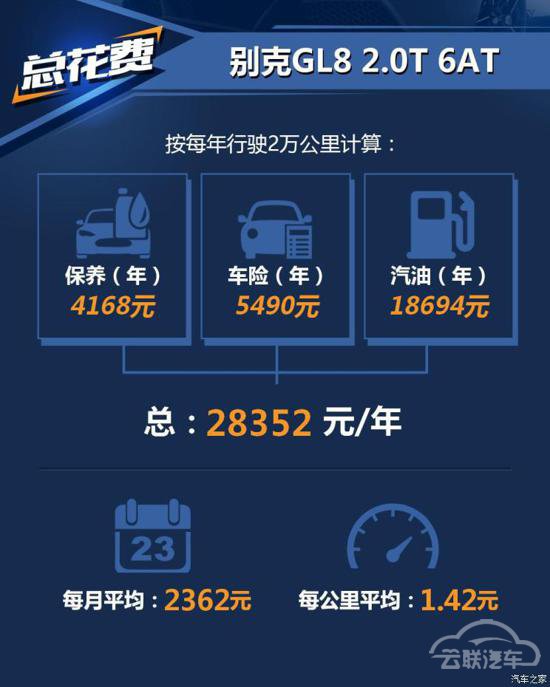 别克gl8每两万公里进行一次我们常规所说的“大保养”,但小保养的时间间隔为5000公里,有些频繁。根据汽车之家口碑显示,别克gl8平均油耗为13l/100km,约合每公里0.93元,在同级别mpv车型中,也不算低了,如果以年行驶两万公里计算,油耗花费在1.8万元以上。总养车费用每年约为2.8万元,平均每公里1.42元。