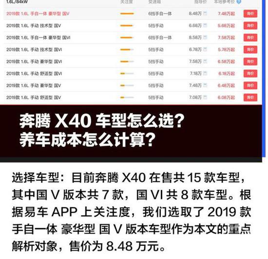 说起小型suv,优点简直太多了:便宜、省油、好停车,空间也要比轿车宽敞不少,城市代步的不二之选。这两年各大车企也都十分重视小型suv市场,一汽奔腾早在2017年初就发布了奔腾x40,如今带来了中期改款的2019款。那么这么一台售价不到10万元的小型suv购车后的养车、用车成本是怎么样的呢?编辑带着这些疑问走进了一汽奔腾北京的4s店,给大家一一解答这些问题。