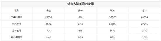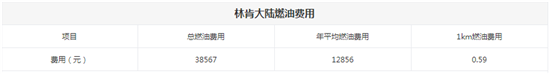 燃油费用小结:林肯大陆百公里8.7L的油耗表现对于一台中大型车型来说,算是比较出色的数据了。从上述表格的数据中也可以看出,每公里燃油费用约为0.59元,年平均燃油费用约为12856元,三年65000km的总燃油费用约为39567元。其中,0.59元的每公里燃油费用这样的数据在同级别中有着非常大的优势。